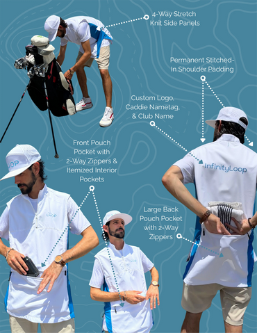 At InfinityLoop, we know how frustrating it can be to get a bad bag strap. That's why we've decided to build permanent, stitched-in shoulder padding to every single Zephyr™ premium caddie bib. While it won't make bags any lighter, but it will protect against bag straps that have a tendency to dig into your skin and cause pain. Say goodbye to shoulder pain!